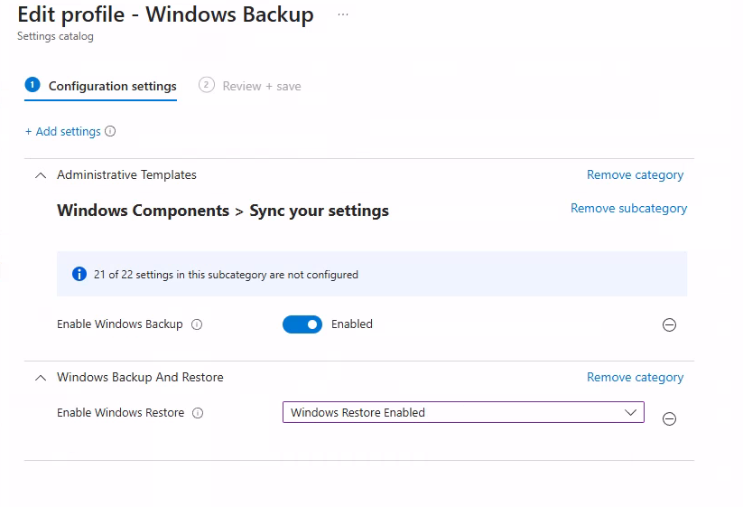 Create a Configuration Profile: Go to Devices > Windows > Configuration Profiles and create a new profile using the Settings Catalog. Search for “Windows Backup” and enable the settings. Assign this to your user groups.