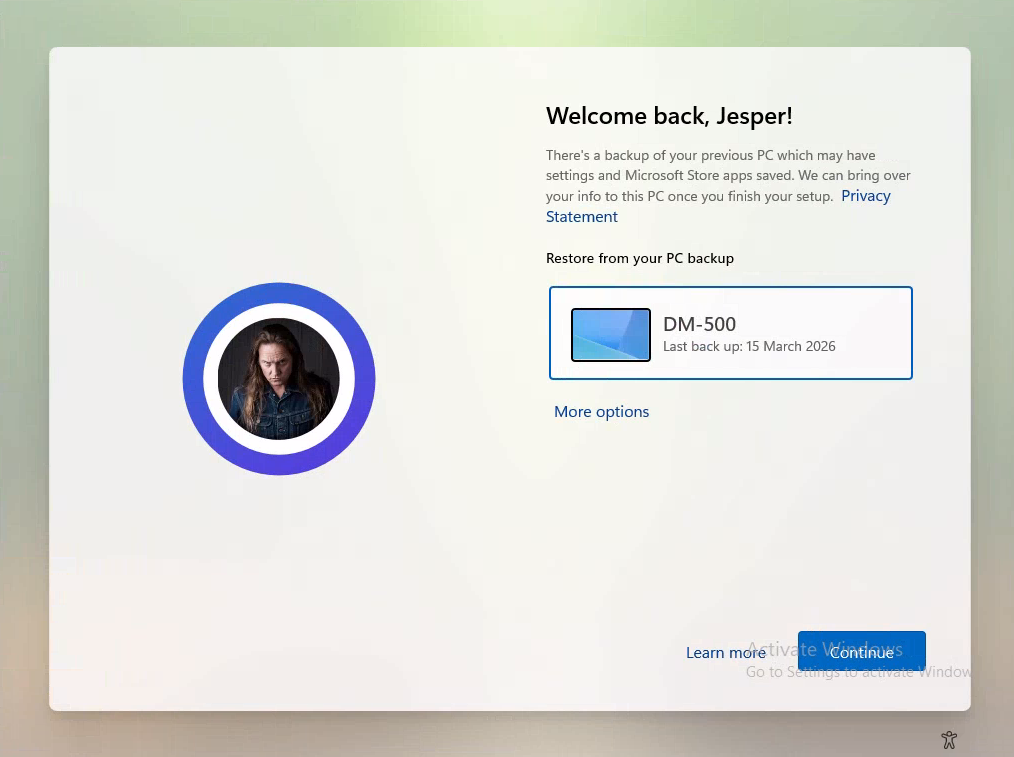 In the supported scenario, the user starts a user-driven Autopilot enrollment on the new device and signs in with the same Entra ID account used on the previous device. If a valid backup exists and the device meets the requirements, Windows presents the restore page during setup. The user can then choose a previous backup and continue the enrollment flow.