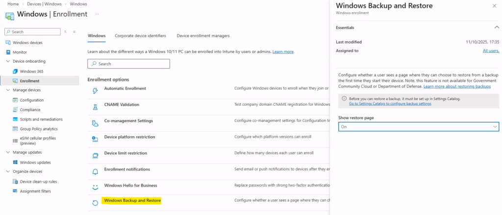 Enable Restore in OOBE: To allow users to retrieve their backup during the initial setup, navigate to Devices > Enrollment > Windows Backup and Restore. Toggle Show restore page to On.