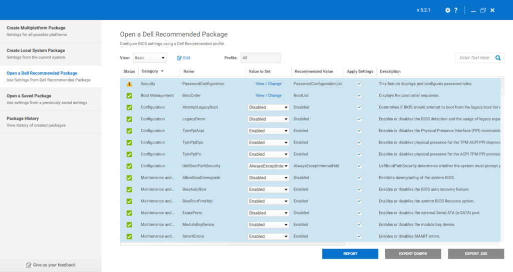 In Dell Command | Configure, build a baseline that fits your standard: virtualization options, boot settings, security toggles, and device-specific options where relevant.