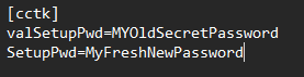 Now we have the cctk file, open the file that needs the current password in an text editor, Notepad Vs code or similar. Do the same for the new devics and our baseline (Track B).