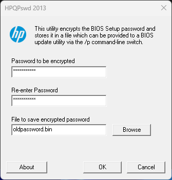 Start HpqPswd64.exe and set the old password for current devices. Do this twice so we get another file with the new password.